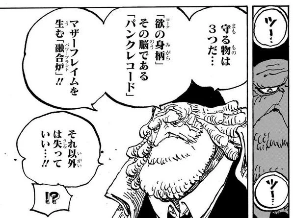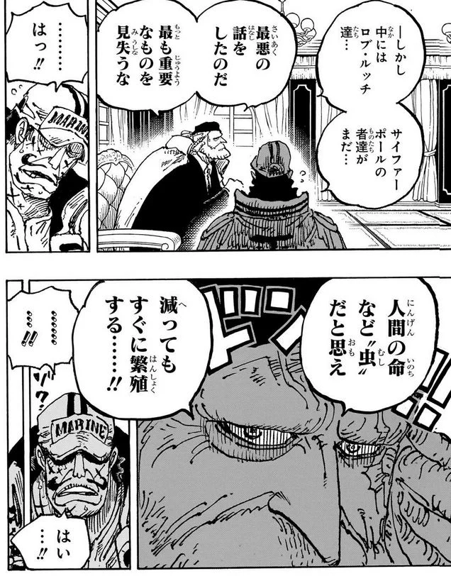 五老星は人の命は屁とも思っておらず、必要な「欲(ヨーク)」「パンクレコード」「融合炉」以外は失っても構わないと伝えますが、失っても構わないの中に海兵も入ってるのが悲しい。