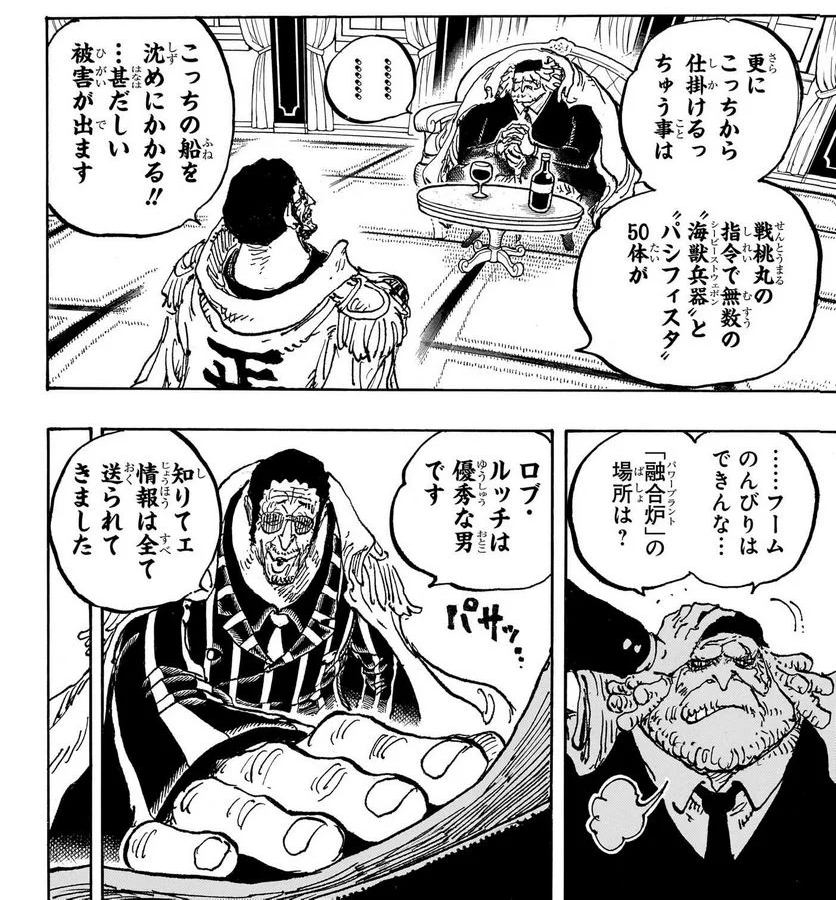 黄猿は盗聴して五老星とルフィの会話も聞いてたろうし、「知りてェ情報」っていうのは世界政府の裏の顔のことも含まれてるんでしょうね。